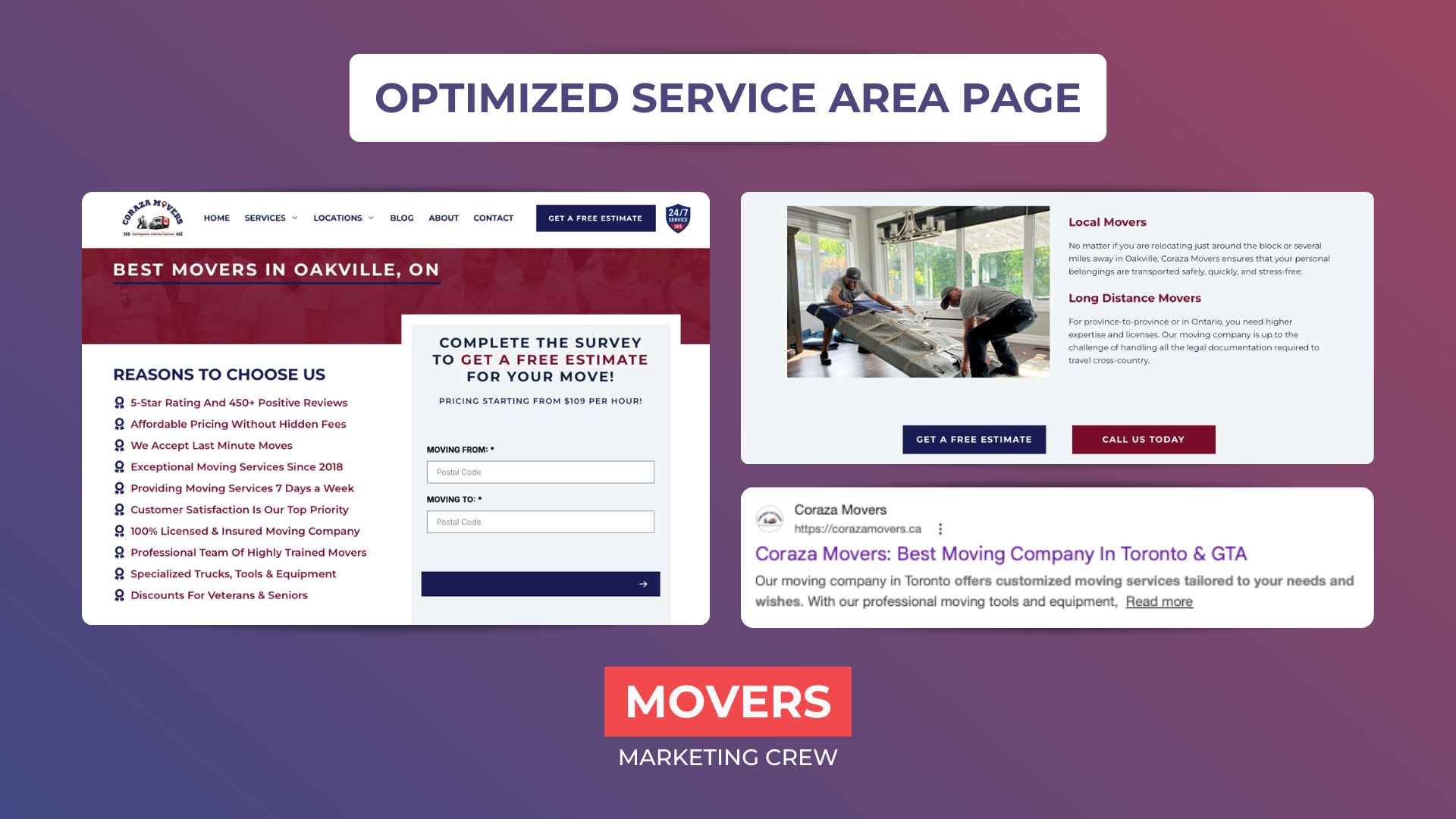 Service area pages are specialized web pages within your website, that are dedicated to a single area, town or neighborhood in which your moving company provides service. These pages consist of in-depth, local content that clearly resonates with potential clients seeking movers in their area. They include service descriptions, local reviews, localized terms, which builds credibility, and most importantly: trust.