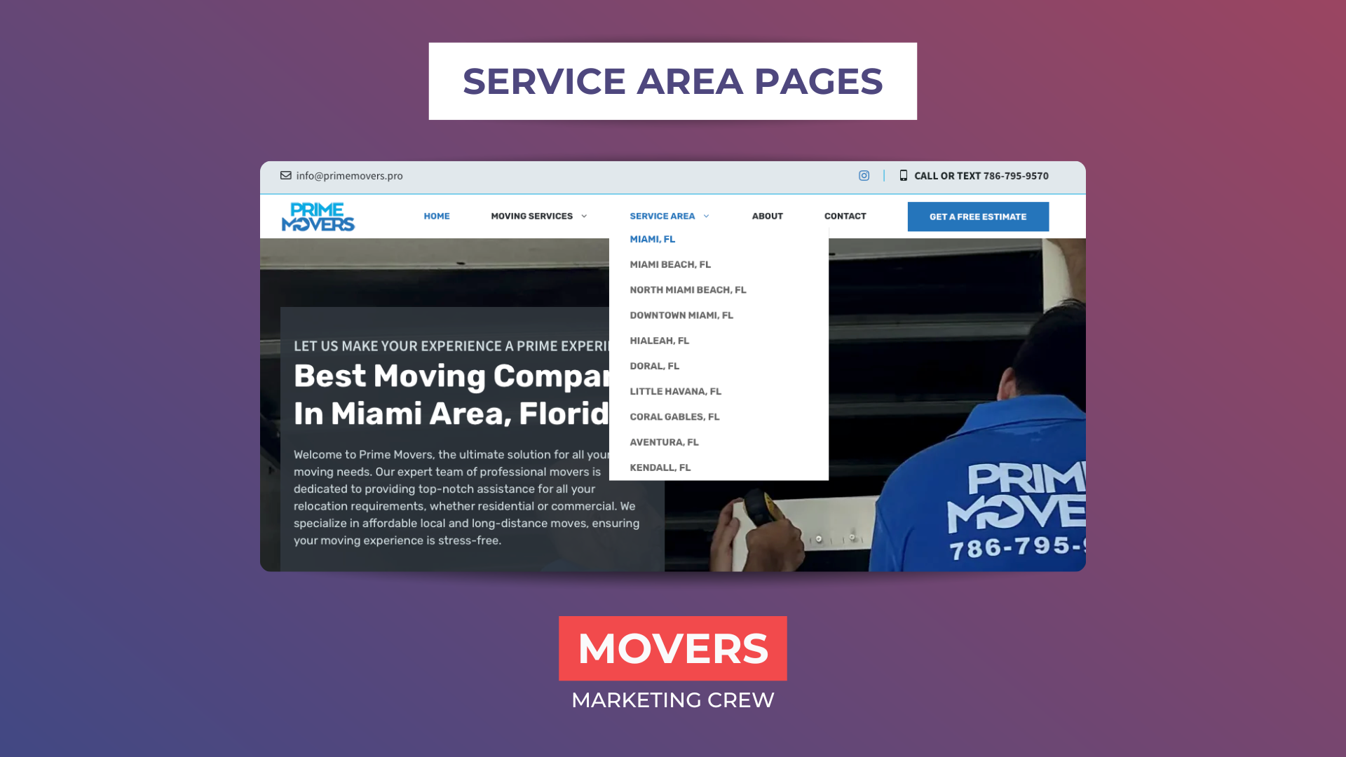 Creating service area pages for your moving company website is a powerful marketing tool to improve your local SEO, increase conversion rates and generate more high-quality leads relevant to your service area. When you focus on search engines, and more importantly, user intent, you start to appear more prominently when someone searches for services in your area. If you still don’t have service area pages, take this as a sign to set them up, because your next local customer could be just a search away.