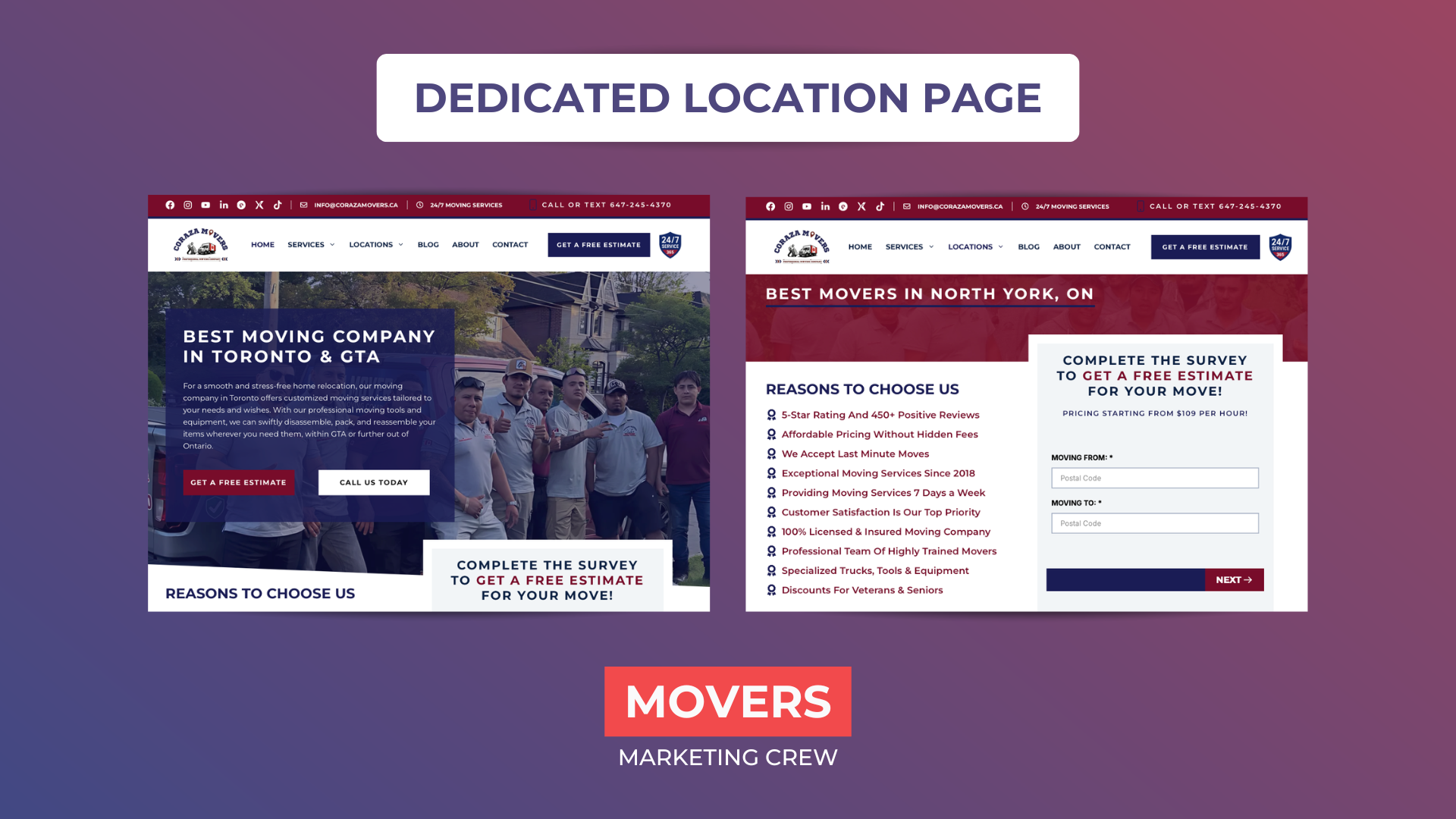 Create a clean URL structure that makes sense to the search engines, such as corazamovers.ca/movers-north-york. Treat this new page like a mini-homepage for that specific branch. Never copy and paste the text from your main page and just swap out the city names. Google penalizes duplicate content. Your new copy needs to include the new NAP (name, address and phone number), specific services, local proof and embedded Google Map.