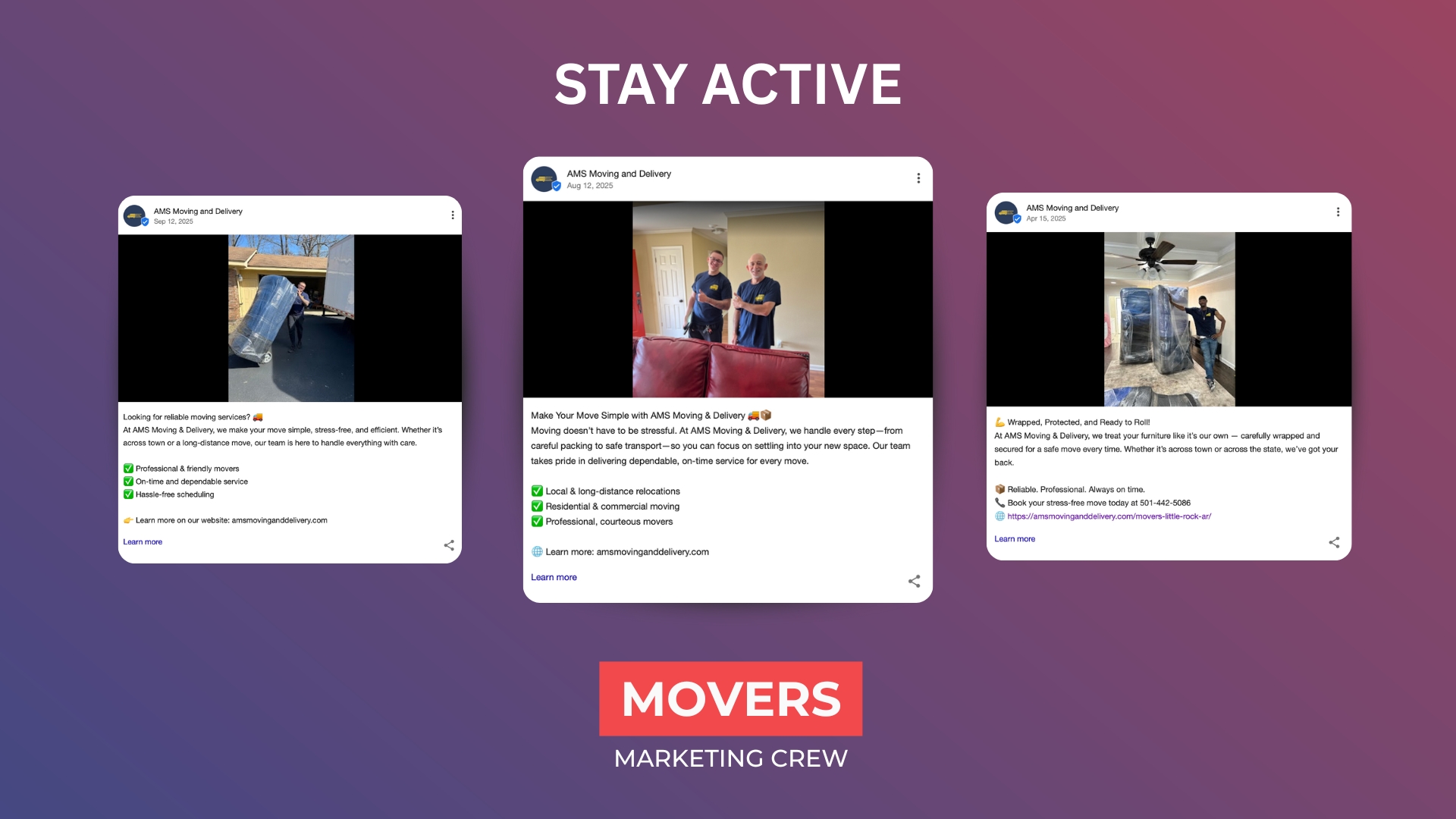 Building a successful moving company today takes strategy and consistency. Every piece of your online presence plays a vital role in your growth: citations help Google verify your business, visuals build trust, reviews prove your reliability and consistent posting keeps your company top of mind. The moving industry rewards those who show up consistently. It’s not about doing things perfectly from day one, but about learning, improving and adapting your strategy as you go.