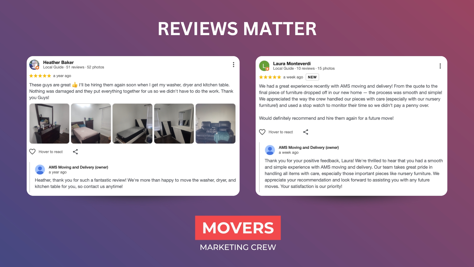 Customer reviews are one of the strongest trust signals for your moving business. If you are just starting out, ask your friends and family to leave honest reviews and help you get the ball rolling, but don’t overdo it. One review per week at the beginning is enough to build momentum.